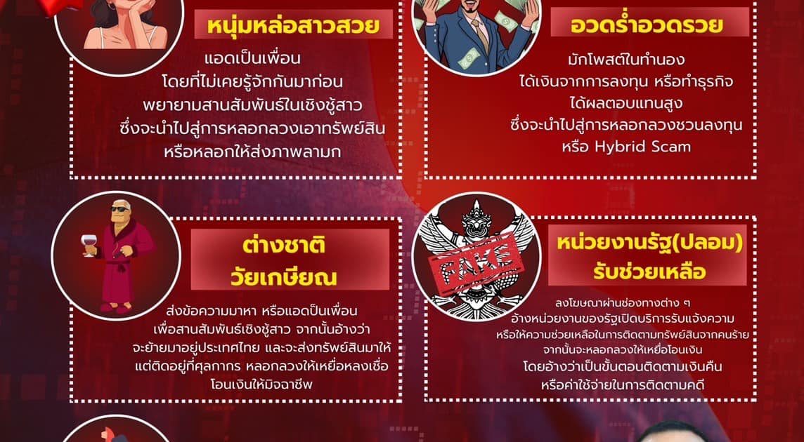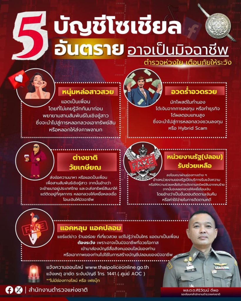 พล.ต.ต.ศิริวัฒน์ ดีพอ รองโฆษกสำนักงานตำรวจแห่งชาติ เปิดเผยว่า พล.ต.อ.ต่อศักดิ์ สุขวิมล ผบ.ตร. ได้มีความห่วงใยพี่น้องประชาชนที่อาจได้รับความเสียหายจากอาชญากรรมรูปแบบต่าง ๆ ซึ่งในปัจจุบันกลุ่มมิจฉาชีพยังคงมีการพัฒนารูปแบบในการหลอกลวงพี่น้องประชาชนอยู่เสมอ มีการนำหลักจิตวิทยามาปรับใช้ใช้ในการหลอกล่อให้ผู้เสียหายหลงเชื่อ และพบว่ากลุ่มมิจฉาชีพมักสร้างบัญชีสื่อสังคมออนไลน์ขึ้นมาเพื่อใช้เป็นเครื่องมือในการหลอกลวงเหยื่อ เช่น สร้างบัญชีปลอมเป็นบุคคลมีชื่อเสียง สร้างบัญชีปลอมเป็นหน่วยงานของรัฐ สร้างบัญชีที่ไม่มีตัวตนอยู่จริง(บัญชีอวตาร) หรืออ้างว่าตนเองมีฐานะร่ำรวย เป็นต้น