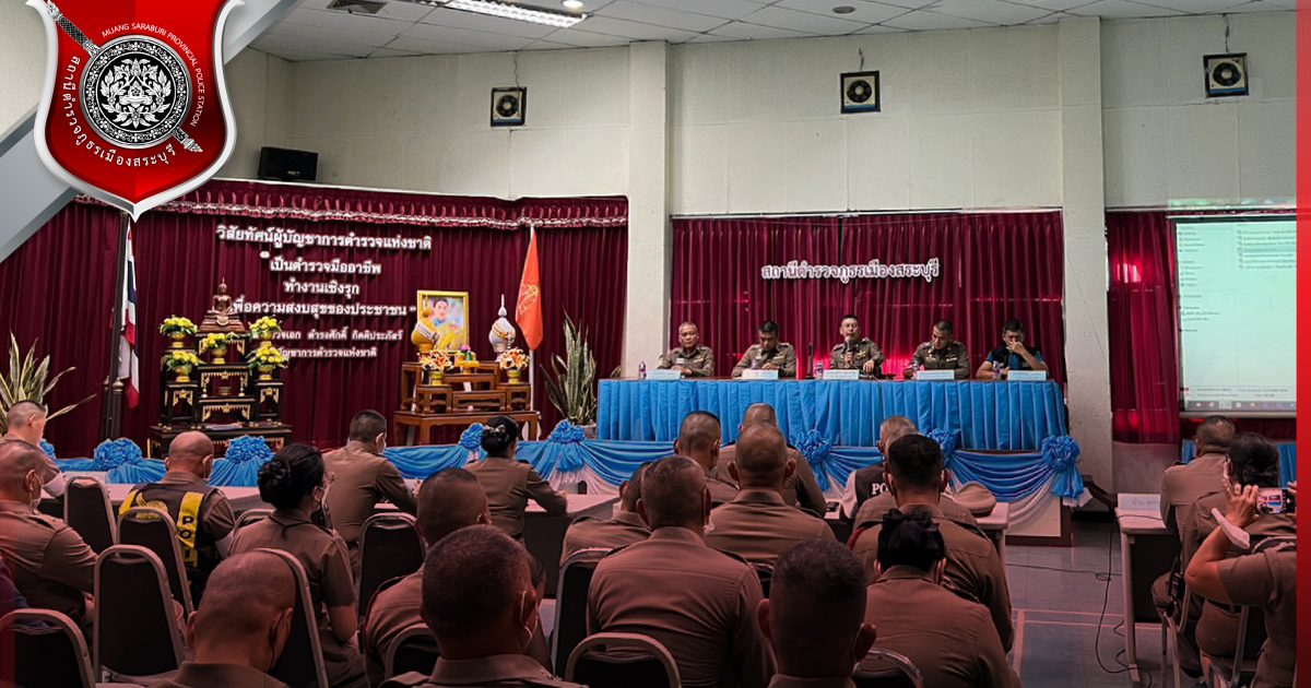 พ.ต.อ.สุริยะ สุดกังวาล ผกก.สภ.เมืองสระบุรี ประชุมมอบนโยบาย ข้อสั่งการ ระเบียบ ข้อบังคับ ให้แก่ข้าราชการตำรวจ สภ.เมืองสระบุรี ภายใต้มาตราการป้องกันเหตุ และรักษาความสงบเรียบร้อย ในช่วงเทศกาลสงกรานต์ 2566 ณ สภ.เมืองสระบุรี