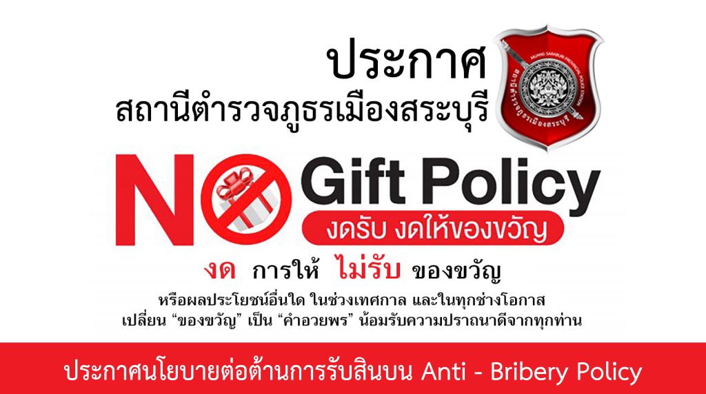 พ.ต.อ.สุริยะ สุดกังวาล ผกก.สภ.เมืองสระบุรี พร้อมข้าราชการตำรวจในสังกัดทุกนาย ประกาศนโยบายต่อต้านการรับสินบน (Anti-Bribery Policy) และไม่รับของของขวัญ ของกำนัลหรือประโยชน์อื่นใด (No Gift Policy) จากการปฏิบัติหน้าที่ ตามประมวลจริยธรรมข้าราชการตำรวจ พ.ศ. 2564 ซื่อสัตย์สุจริต ปฏิบัติหน้าที่ตามกฎหมาย ระเบียบแบบแผนของสำนักงานตำรวจแห่งชาติด้วยความโปร่งใส ไม่แสดงออกถึงพฤติกรรมที่มีนัยเป็นการแสวงหาประโยชน์โดยมิชอบ รับผิดชอบต่อหน้าที่สิทธิมนุษยชน มีความพร้อมรับการตรวจสอบและรับผิด มีจิตสำนึกที่ดี คำนึงถึงสังคม