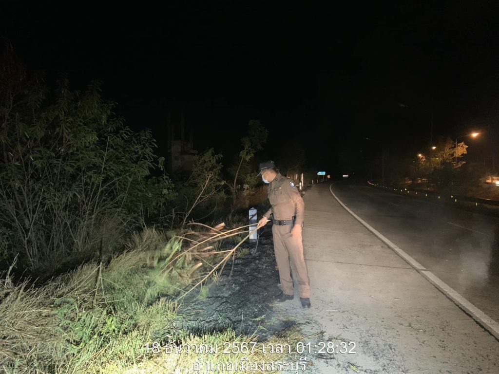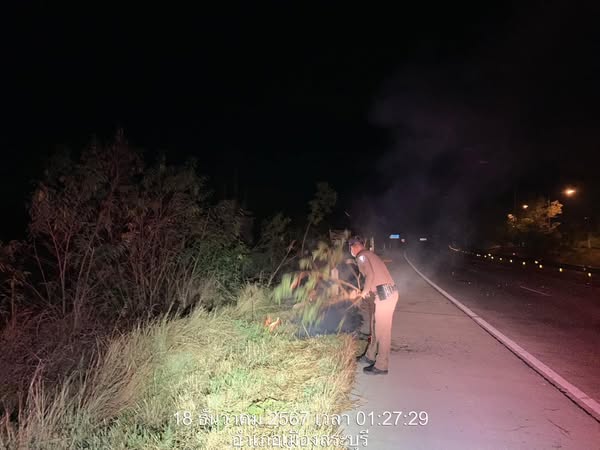 พบ ไฟไหม้หญ้าข้างทาง เกรงว่าจะเกิดอันตราย เจ้าหน้าที่ตำรวจ จึงดำเนินการดับไฟ และออกตรวจในพื้นที่ต่อไป