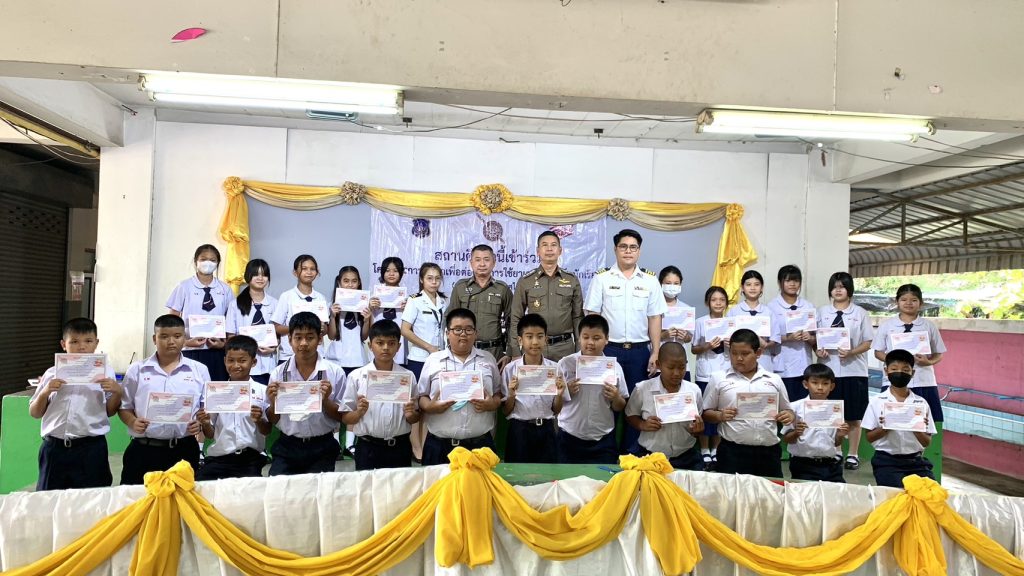 มอบใบประกาศนียบัตรให้แก่นักเรียนตามโครงการการศึกษาเพื่อต่อต้านการใช้ยาเสพติดในเด็กนักเรียน ชั้นประถมศึกษาปีที่ 5 เทอม 2/65 จำนวน 23 คน และมีนักเรียนมัธยมศึกษาตอนต้น รวม 60 คน เข้าร่วมรับฟังการบรรยาย ในหัวข้อ