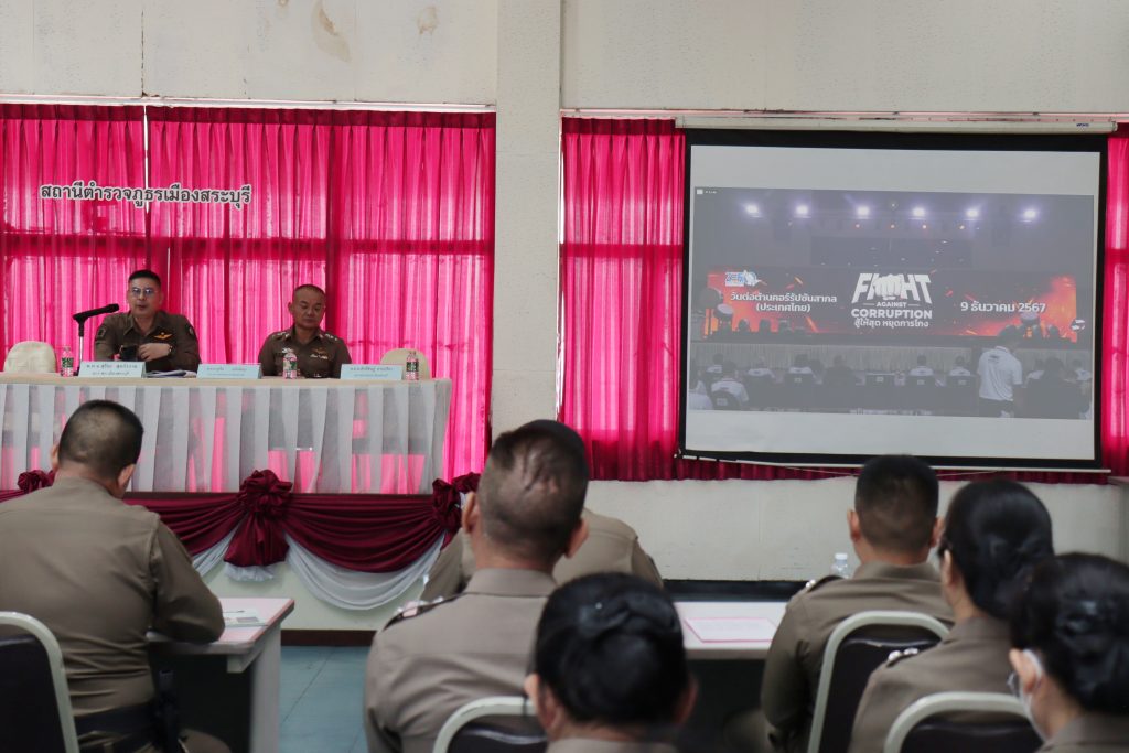 เข้าร่วมรับชมงานวันต่อต้านคอร์รัปชันสากลฯ ผ่านทาง Facebook ของ สำนักงาน ป.ป.ช. ณ ห้องประชุมชั้น 4 สภ.เมืองสระบุรี เพื่อเป็นตัวอย่างให้ผู้ใต้บังคับบัญชา แสดงถึงเจตนารมณ์ ต่อต้านการคอรัปชั่น ต่อต้านการรับสินบน และปลูกจิตสำนึกให้ผู้ใต้บังคับบัญชา ปฏิบัติตามนโยบายขององค์กร