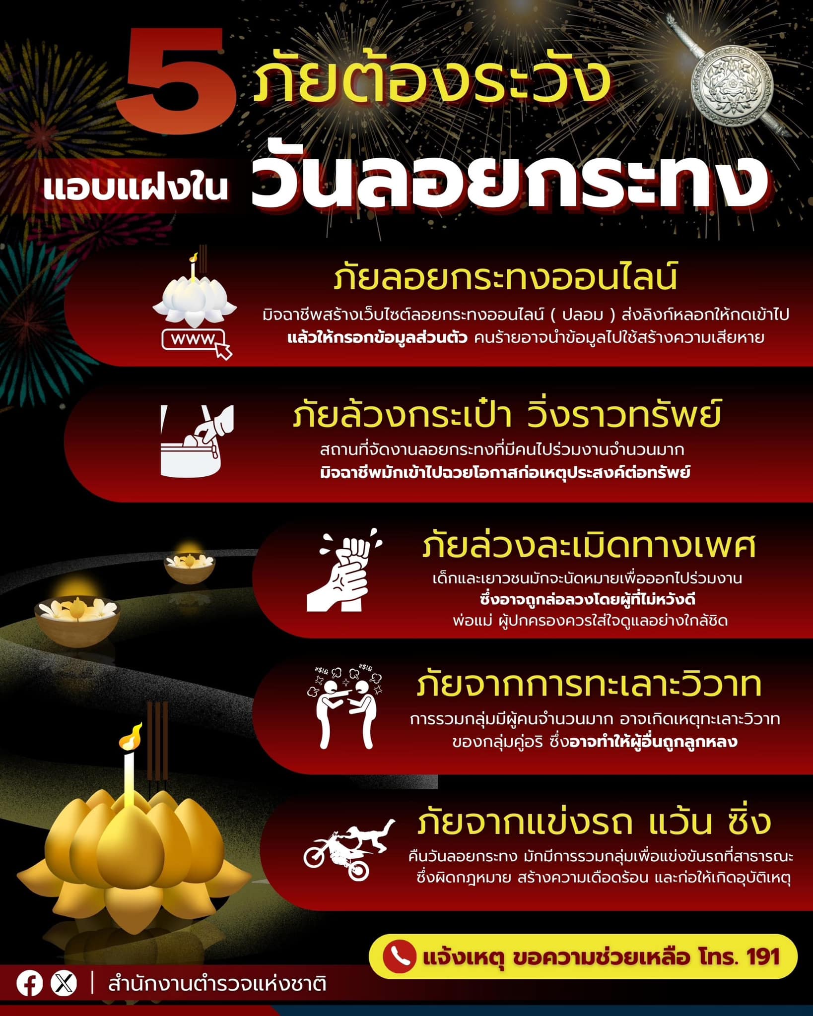 “ลอยกระทง 2566” สำนักงานตำรวจแห่งชาติห่วงใย เตือน 5 ภัยต้องระวัง ที่แอบแฝงมาใน #วันลอยกระทง1. ภัยจาก