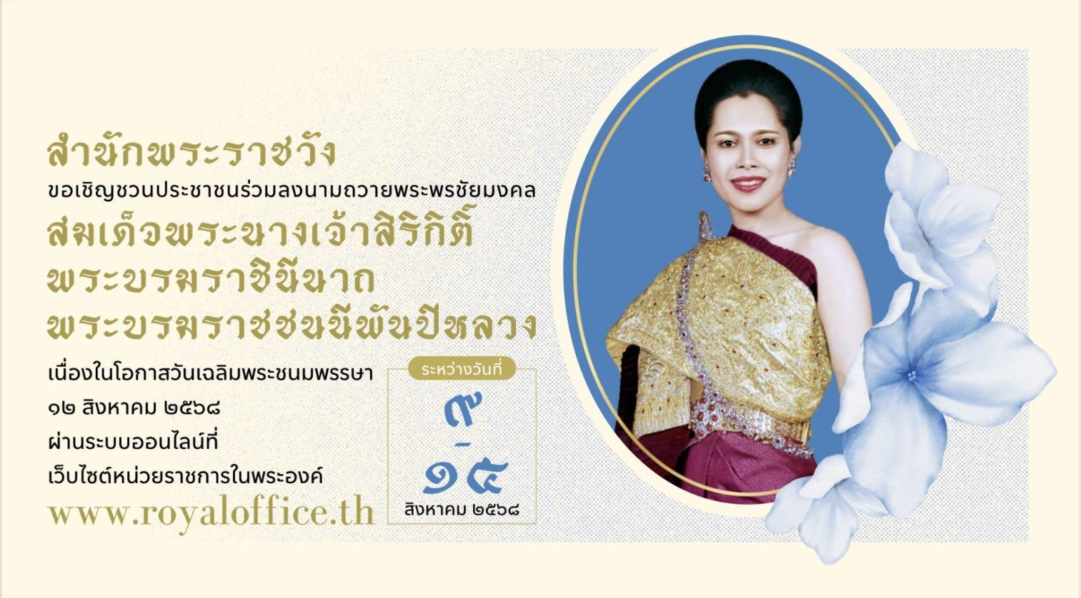 สำนักพระราชวัง ขอเชิญชวนประชาชนร่วมลงนามถวายพระพรชัยมงคล สมเด็จพระนางเจ้าสิริกิติ์ พระบรมราชินีนาถ พ