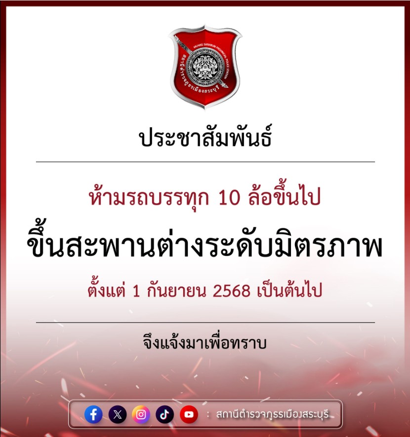 ประกาศห้ามรถบรรทุก 10 ล้อขึ้นไป ขึ้นสะพานต่างระดับมิตรภาพ มีผลตั้งแต่ 1 กันยายน 2568 เป็นต้นไป เพื่อ